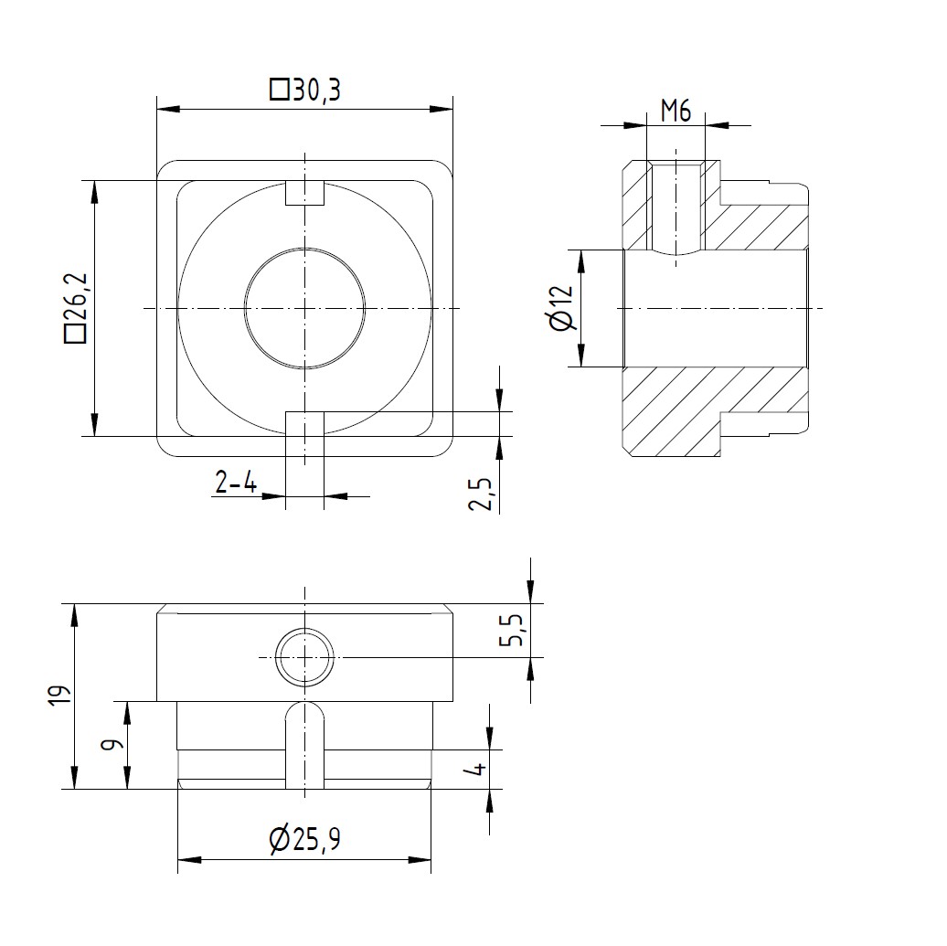 Produktinformationen "Stahl Einschweißdeckel 30 x 30 mit Durchgangsbohrung Ø12,1 mm und Querbohrung M6 "