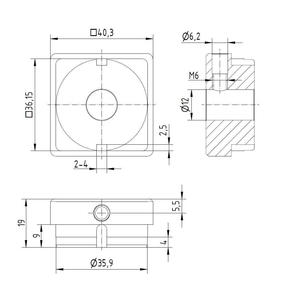 Produktinformationen "Stahl Einschweißdeckel 40 x 40 mit Durchgangsbohrung Ø12,1 mm und Querbohrung M6 "