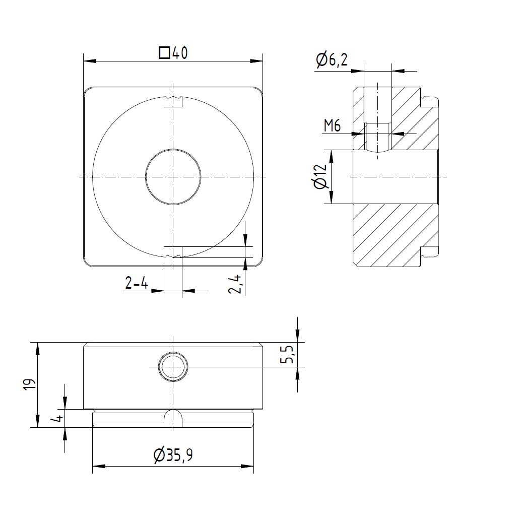 Produktinformationen "Stahl Einschweißdeckel 40 x 40 mit Durchgangsbohrung Ø12,1 mm und Querbohrung M6 "