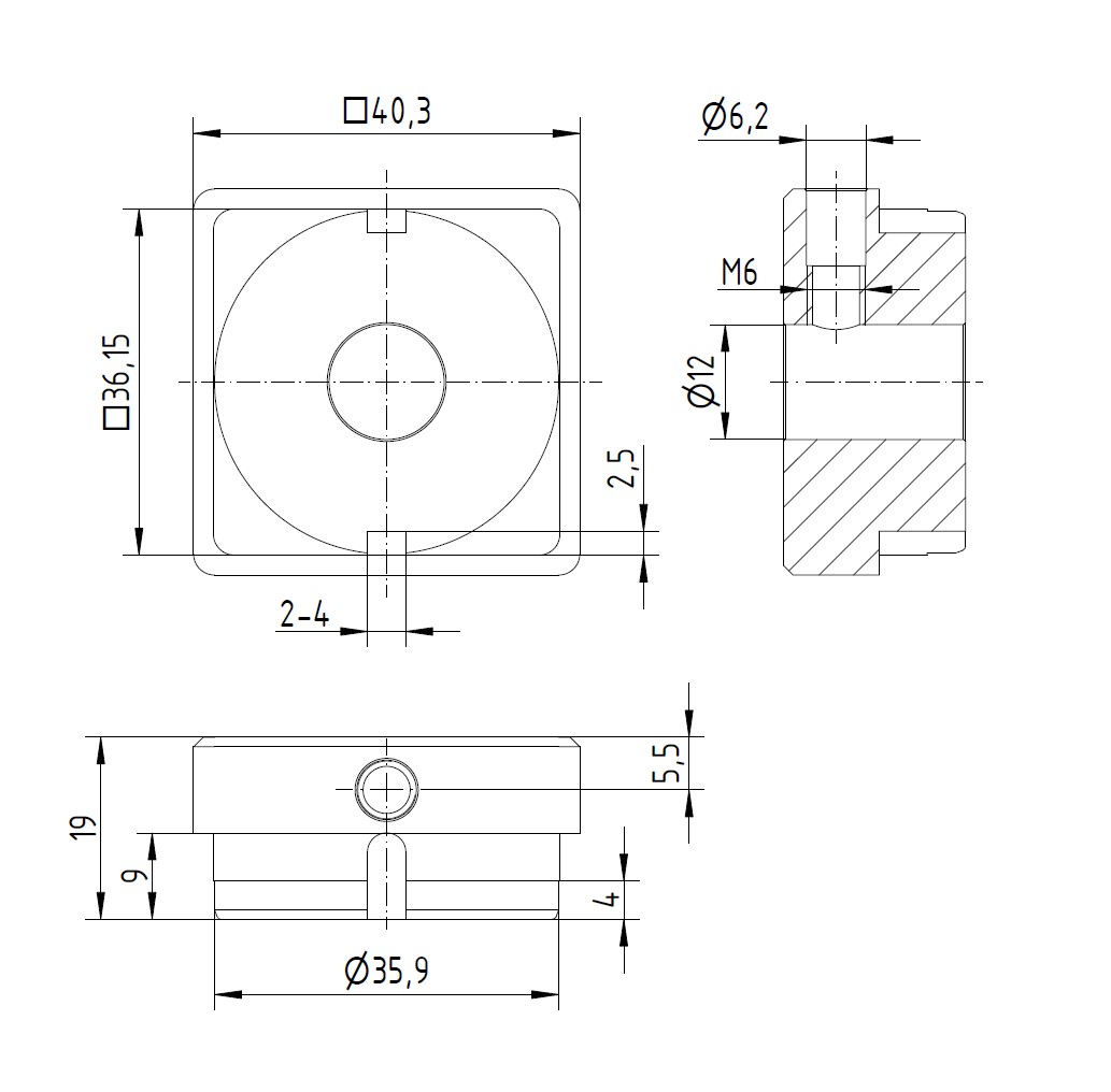 Produktinformationen "V2A Einschweißdeckel 40 x 40 mit Durchgangsbohrung Ø12,1 mm und Querbohrung M6 "