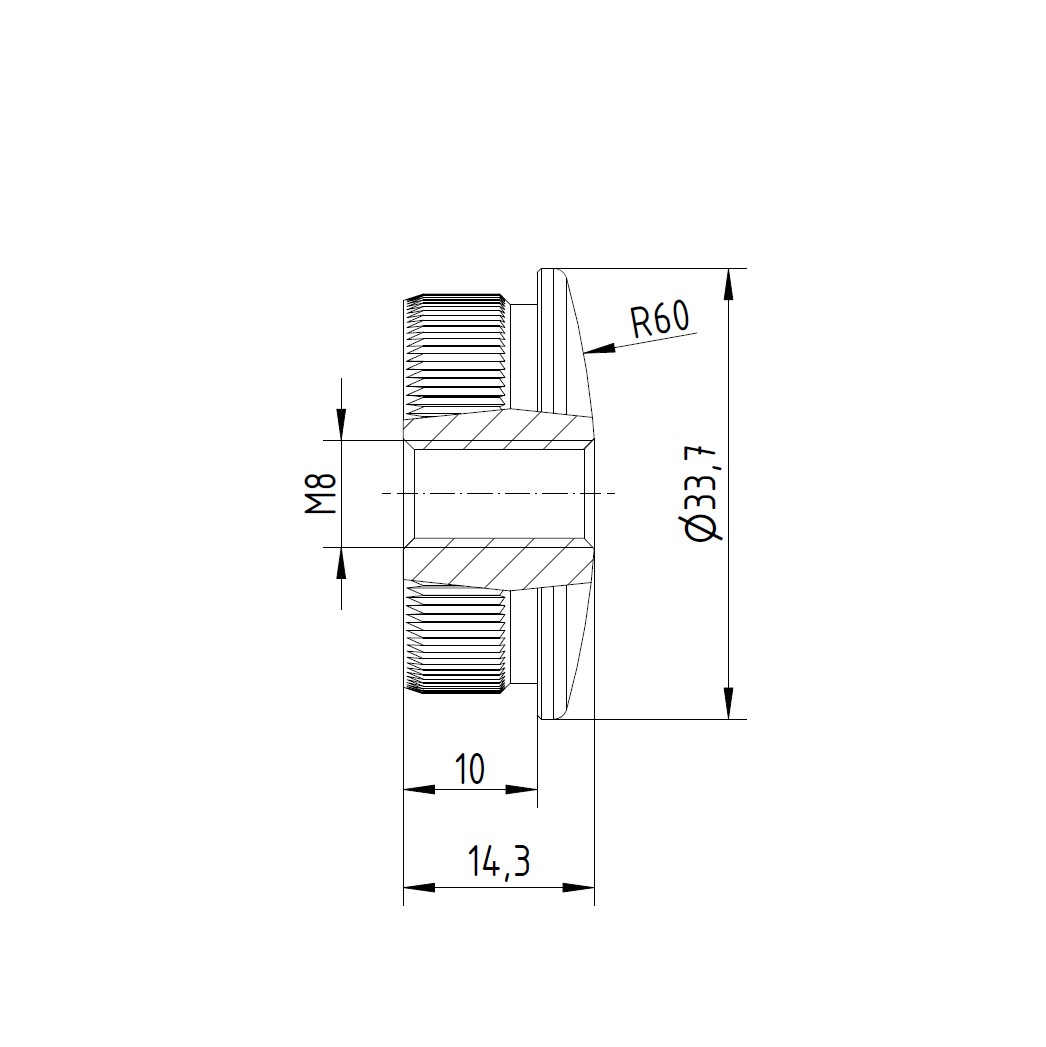 Produktinformationen "V2A Endkappe Ø33,7 x 2,0 mm gewölbt, gerändelt mit Gewinde M8 für Rohr Ø33,7 x 2,0 mm zum einschlagen "