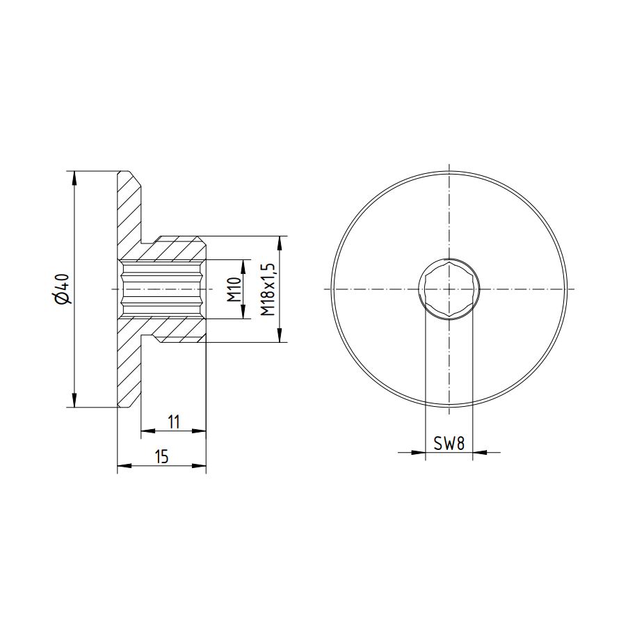 Produktinformationen "V2A Gewindescheibe Ø40 / M18 mit Innengewinde M10, SW 8 für V2A Rohr Ø20 mm "