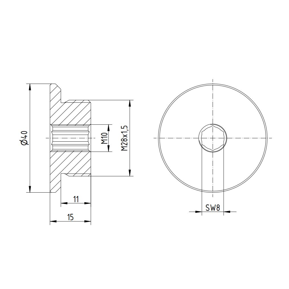 Produktinformationen "V2A Gewindescheibe Ø40 / M28 mit Innengewinde M10, SW 8 für V2A Rohr Ø30 mm "