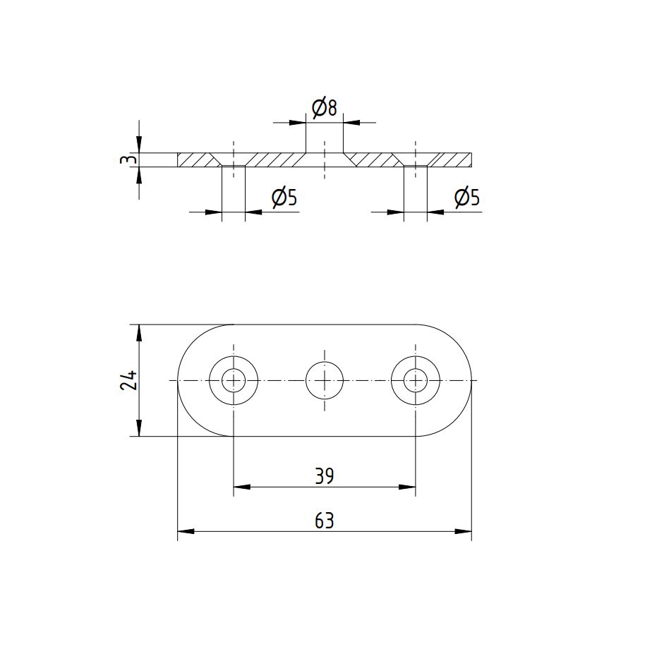Produktinformationen "V2A Handlaufträgerplatte gerade 63 x 24 x 3 mm mit Senkbohrung für M6 einseitig geschliffen 1x Senkbohrung f. M6 mittig"