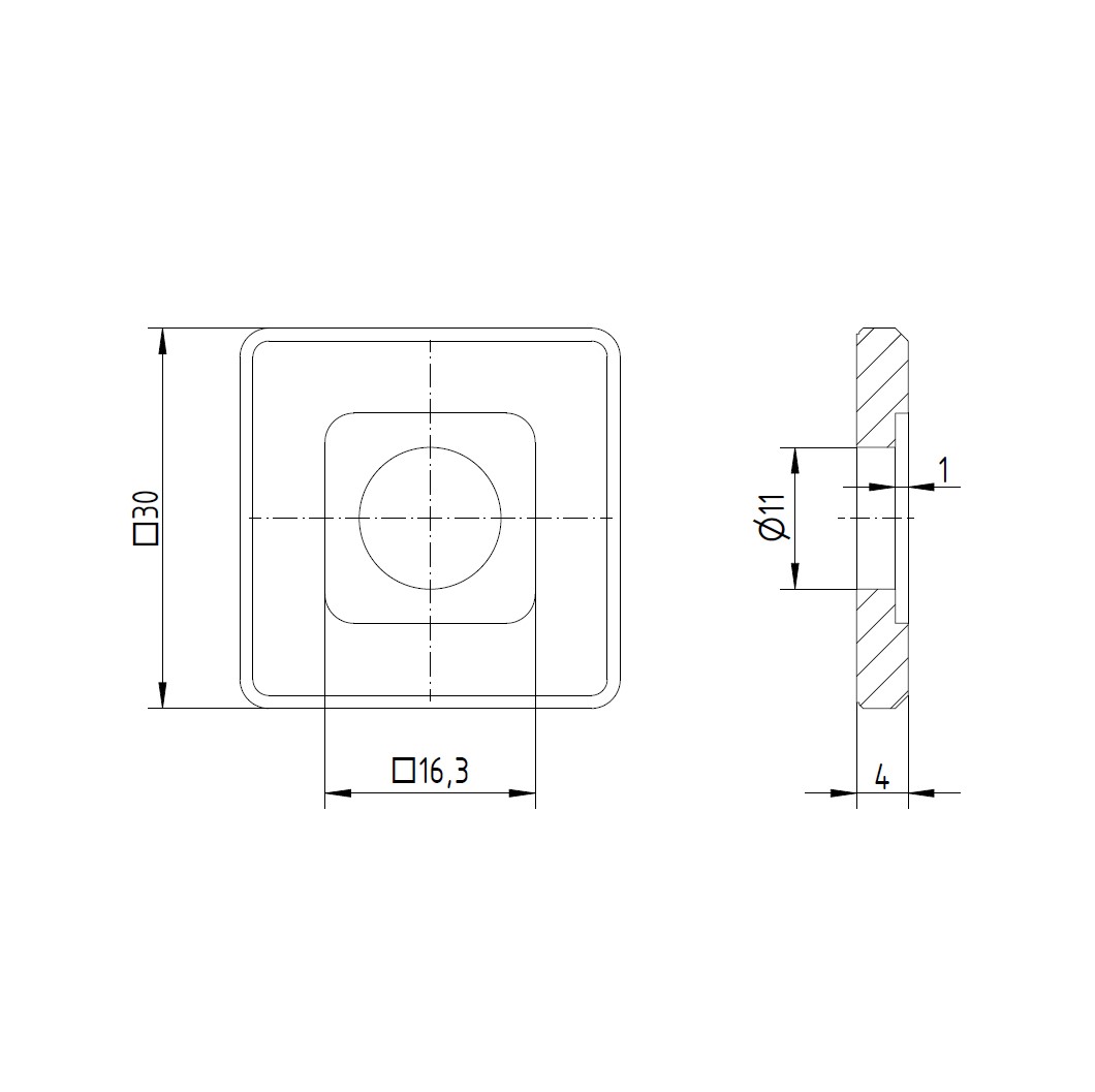Produktinformationen "V2A Quadrat-Scheibe 30x30x4 mm mit Ausdrehung 16x16x1,0 mm und Durchgangsbohrung Ø11 mm "