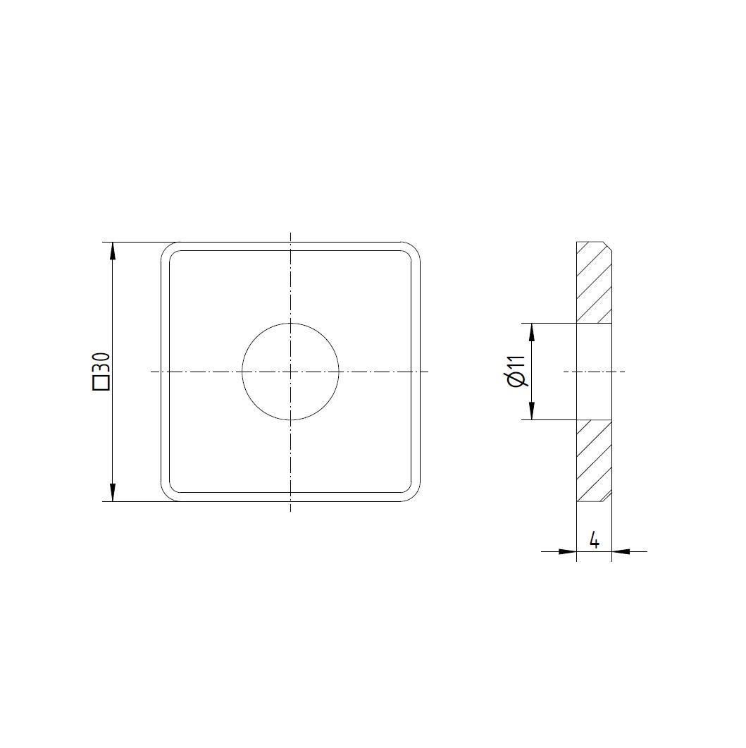 Produktinformationen "V2A Quadrat-Scheibe 30x30x4 mm plan, ohne Ausdrehung mit Durchgangsbohrung Ø11 mm "