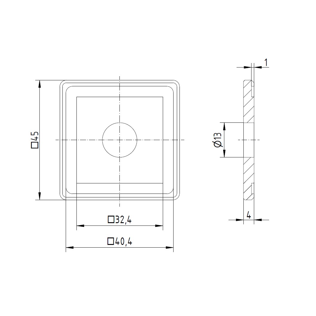 Produktinformationen "V2A Quadrat-Scheibe 45x45x4 mm mit Ausdrehung 40x40x1,0 mm und Durchgangsbohrung Ø13 mm "